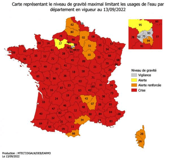 La collecte des eaux pluviales est en tout premier lieu un geste écologique. En effet, avec le dérèglement climatique, les périodes de canicules et les sécheresses sont de plus en plus fréquentes et l’eau devient une ressource de plus en plus rare. A titre d’exemple, début septembre 2022 en France, nous avons encore 2 départements en alerte sécheresse (niveau 2), 12 départements en alerte renforcée (niveau 3), 79 départements en crise (niveau 4).