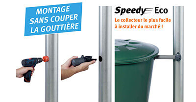 L’installation d’un récupérateur d’eau aérien ou mural est très simple et rapide. Il suffit de percer votre descente d’eau à l’aide d’une scie cloche puis de mettre en place un collecteur de type Speedy. Ce type de collecteur est adapté aux descentes de diamètre 80 et 100 mm en PVC ou en zinc. Ce collecteur se connecte ensuite à votre cuve (qui devra être proche de votre descente). Une fois raccordée, il vous suffira de mettre en place un robinet sur la partie basse de votre cuve et cette dernière sera opérationnelle.