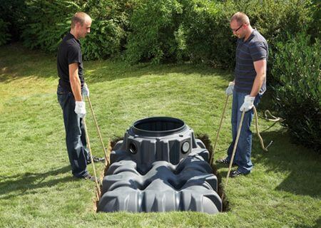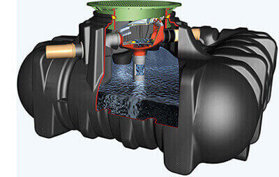Ce type de cuve, extra-plate (platine) ou classique, est enterrée dans votre jardin à proximité de votre réseau de collecte d’eau pluviale (gouttière). Le volume de ces cuves peut varier de 1 500 à 15 000 litres pour les plus grandes. La grande capacité de stockage de ces cuves couplée à un dispositif de pompe permettront d’utiliser cette eau aussi bien pour l’extérieur (nettoyage, arrosage du jardin…) que pour vos besoins sanitaires (chasse d’eau, lave-linge…). Ce type de récupérateur en béton ou en polyéthylène est généralement équipé :