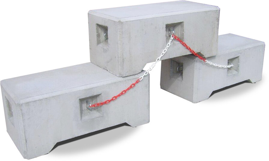 - Modulable : les plots en béton peuvent être empilés, reliés par des chaines afin de réaliser des barrières plus importantes sans gros moyens de manutention.