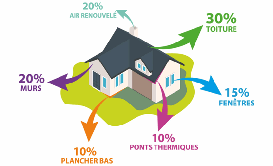 Dans un logement, on estime à 30% la déperdition de chaleur par la toiture. En effet, l’air chaud, plus léger que l’air froid, remonte et « s’échappe » par votre toiture. L’isolation des combles, de toiture classique ou de toiture terrasse est donc le meilleur moyen de réaliser rapidement des économies sur votre facture d’énergie.