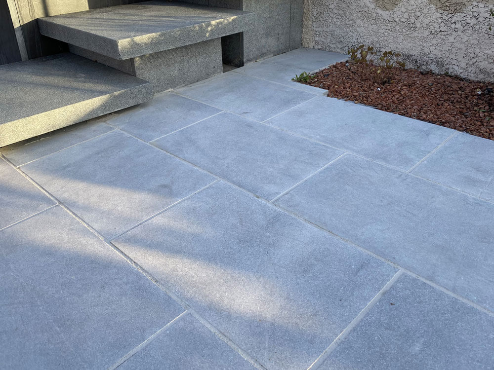 Surface rugueuse antidérapante. Ce traitement peut néanmoins modifier légèrement les nuances de la pierre |