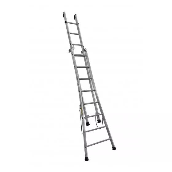 Cette échelle présente 3 types d'utilisation : 1 - en escabeau 2 - En échelle 3- En appui - Nombre de barreaux 7+8 - Longueur repliée 2m50 - Hauteur austostable : 2m20 - Longueur déployée 3m75 - Hauteur d’accès max.* 4m80 - Poids 9.45 (kg)