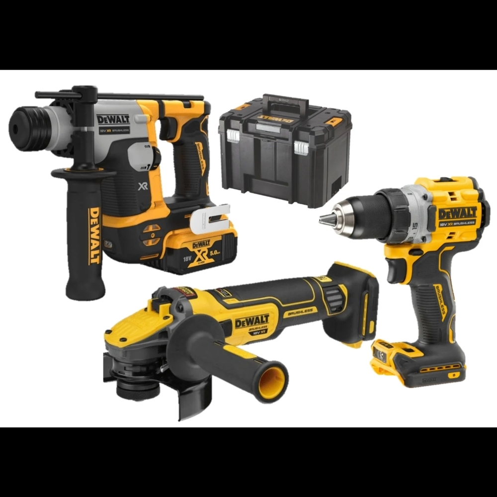 Description du produit : Ce pack de 3 machines Dewalt contient trois machines sur batteries primordiales pour vos travaux, à savoir : une perceuse à percussion, un perforateur SDS-plus et une meuleuse de diamètre 125 mm. Ce pack contient également 2 batteries XR 18 V, 5AH type LI-ION ainsi que...