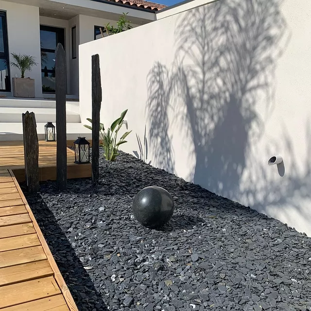 La paillette d'ardoise (30 - 70 mm) est une solution idéale pour réaliser la décoration de vos massifs et parterres. En effet, sa couleur noire sublime vos plantes, végétaux ou galets blancs. De plus, elle limite la pousse des mauvaises herbes et réduit les variations de chaleur au pied de vos plantes. En complément, l'ardoise permet de réduire l'apport en eau pour les végétaux. A noter qu'avec le vieillissement, le schiste étant chargé en fer, vous pourrez constater l'apparition de trace de rouille ce qui conférera un style authentique à votre massif. A noter que nous vous conseillons l'utilisation d'une toile de paillage afin de maintenir le paillage d'ardoise et limiter la pousse des mauvaises herbes. Afin de recouvrir 1 m2 (sur une épaisseur de 3 à 4cm), vous aurez besoin d'environ 60 kg.