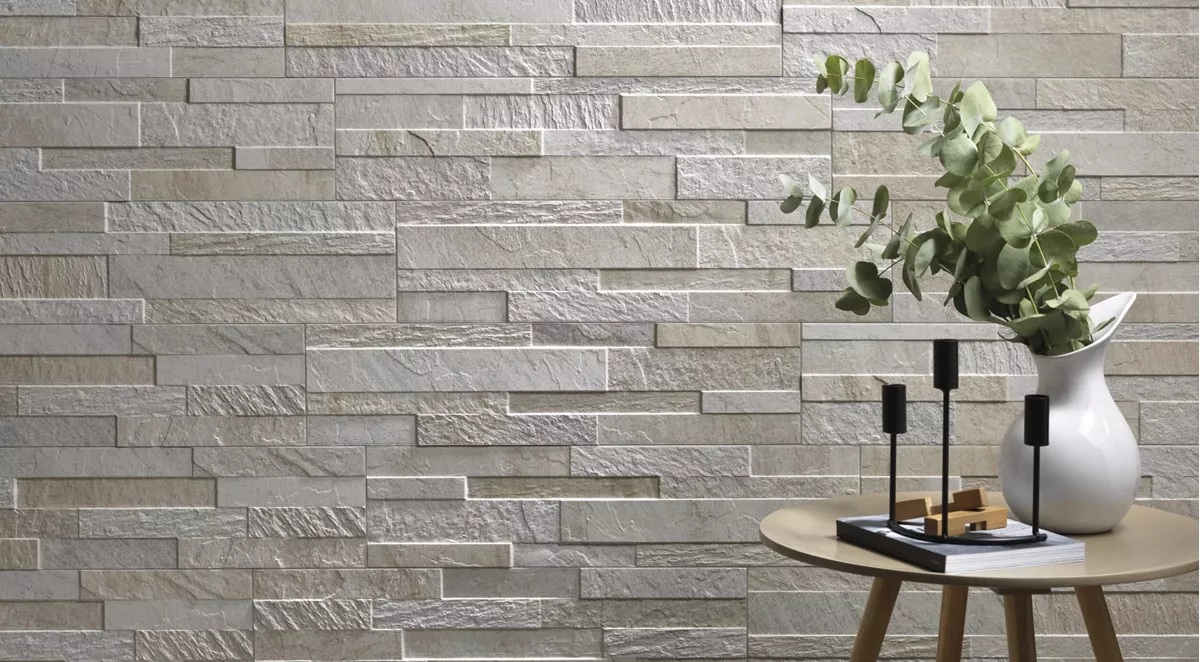 Parement effet pierre naturelle en carrelage, série Cubics, nuances de blanc