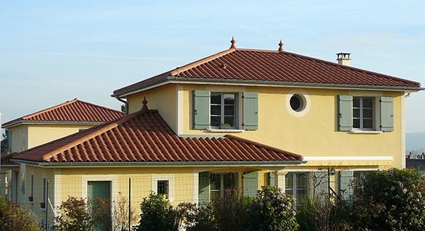 La tuile OMÉGA 10 Ste Foy est une grande tuile fortement galbée produite sur les sites de Quincieux et de Ste Foy l’Argentière en pays rhodanien. Elle se caractérise par sa casquette débordante et une arête cornet/plateau très prononcée apportant à la toiture une esthétique canal unique.