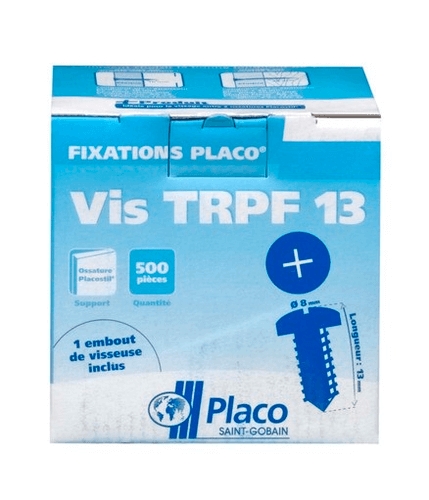 La vis TRPF 13 de Placo est une vis autoforeuse à tête ronde pointe foret qui s'utilise pour l'assemblage d'ossatures Placostil. Elle permet également de fixer entre eux 2 accessoires métalliques d'épaisseur 2 mm maximum. La vis TRPF 13 s'utilise pour la réalisation de plafond, cloison et...
