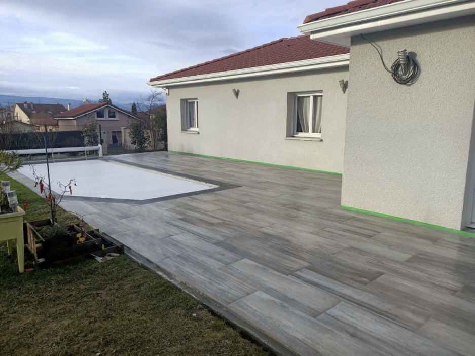 Cette terrasse en grès cérame est réalisée avec des lames imitation bois et de couleur gris. Les margelles de la piscine sont elles gris foncées pour apporter du contraste et être en harmonie avec un maison moderne.