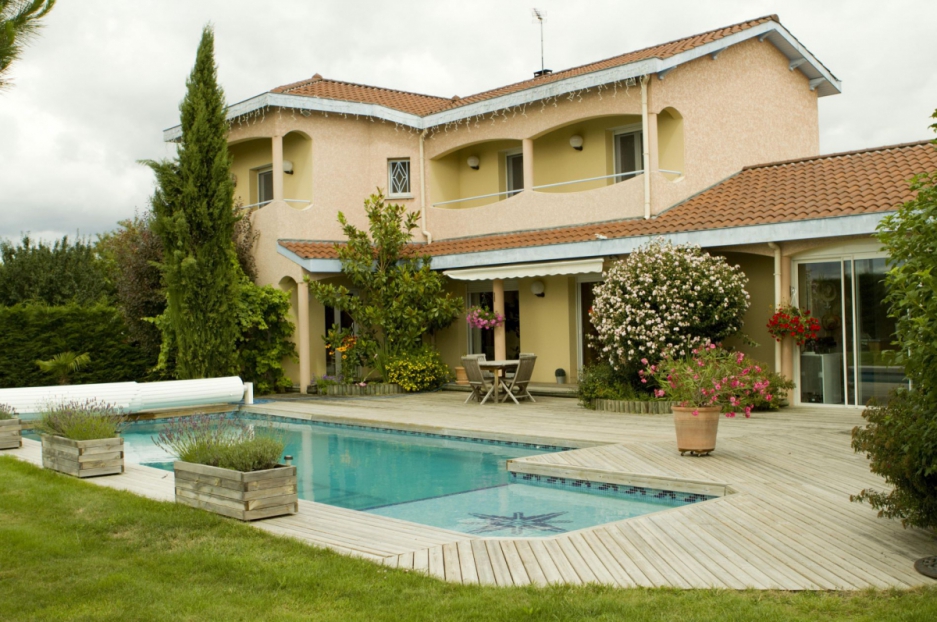 Cette sublime terrasse est réalisé avec du pin vert traité classe 4 pour être posé en bordure de piscine.